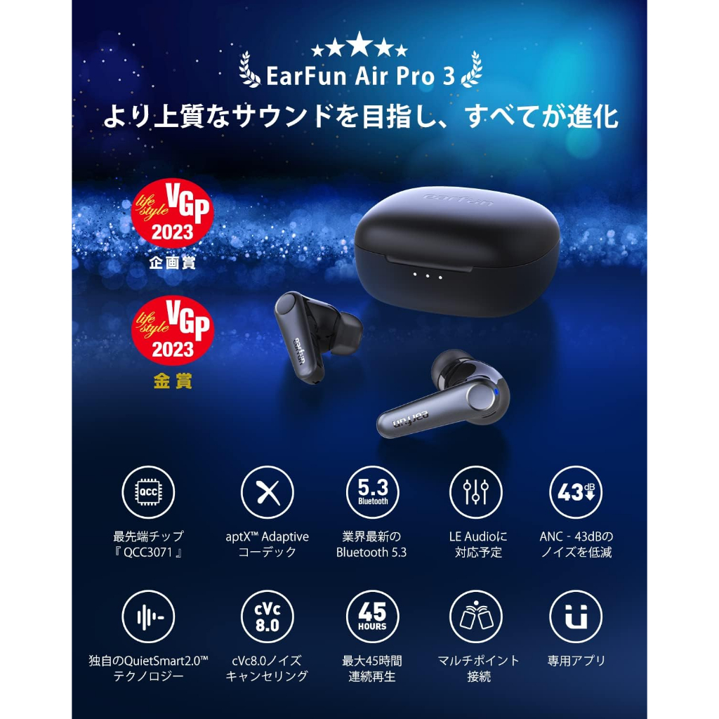 [Direct from Japan]EarFun Air Pro 3 Fully Wireless Earphones with ANC [Bluetooth 5.3 + Noise Cancellation up to 43dB] with QCC3071 chip/aptX adaptive support/planned LE Audio support/ultra low latency