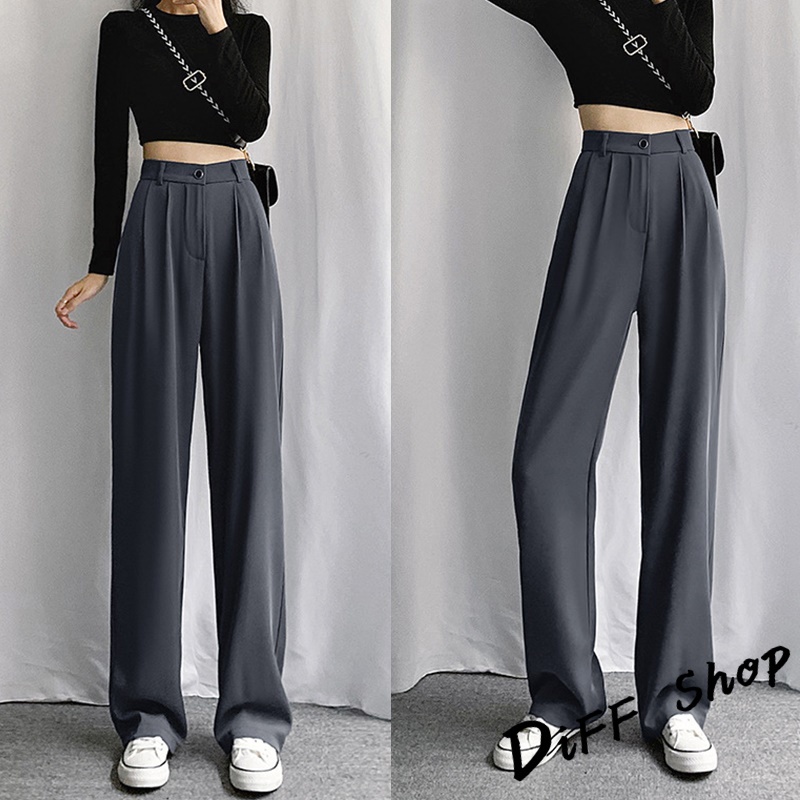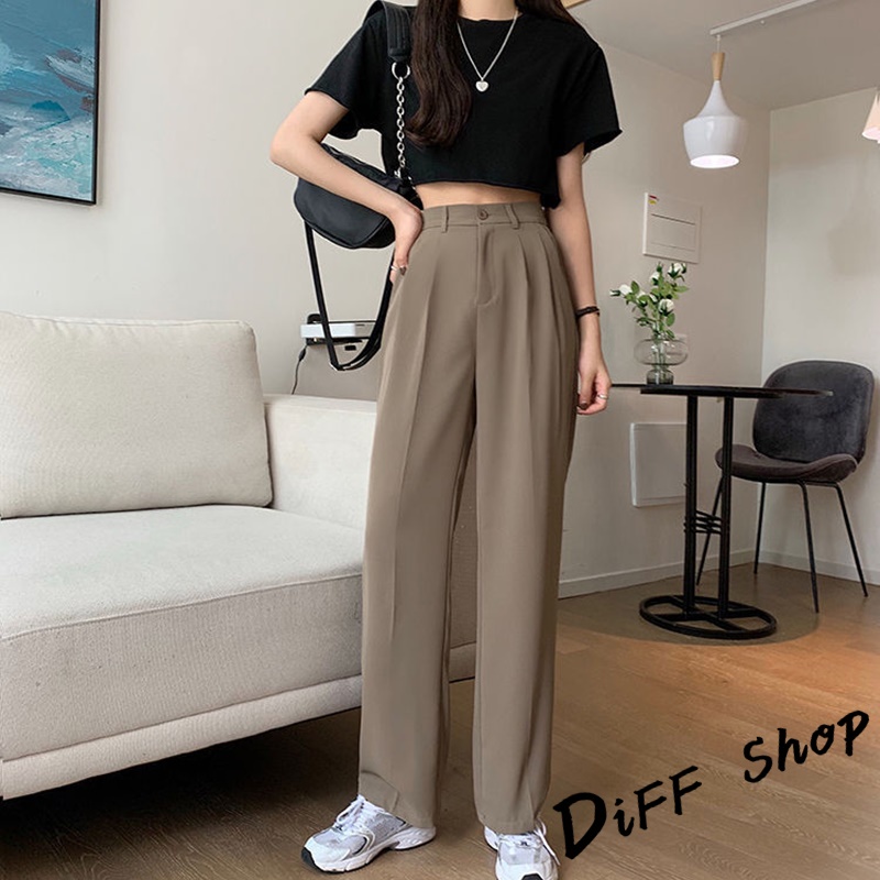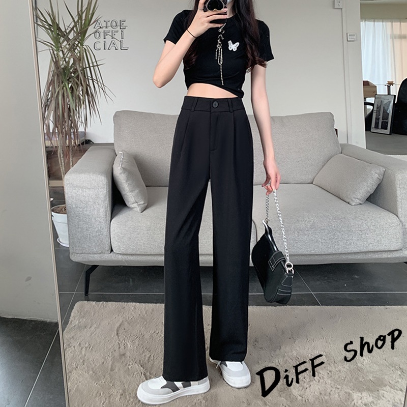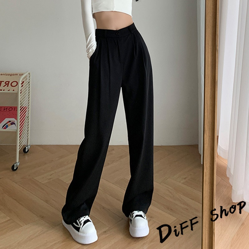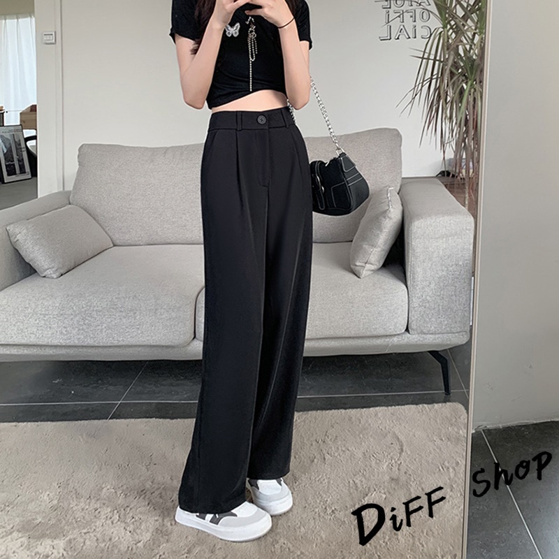 【DIFF】韓版黑色小個子高腰直筒垂感休閒西裝褲 寬褲 褲子 黑褲 長褲 休閒褲 女裝 涼感褲女 透氣長褲【P130】