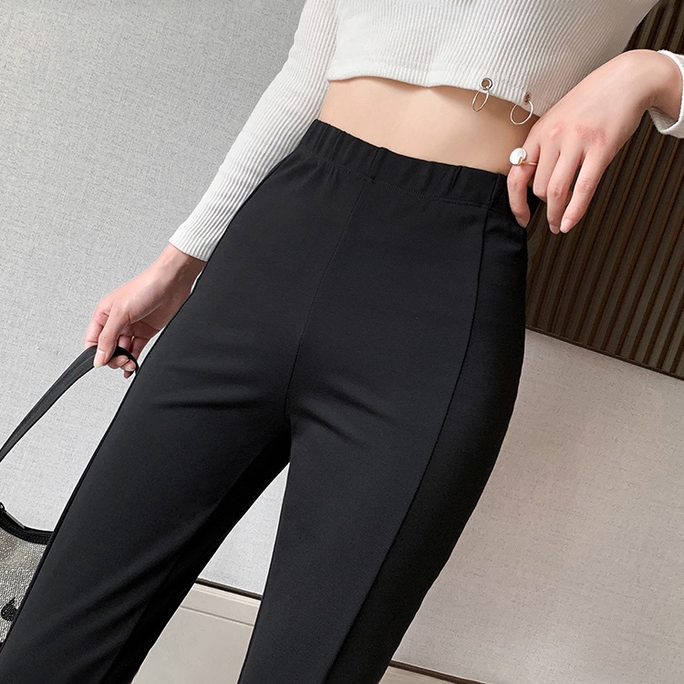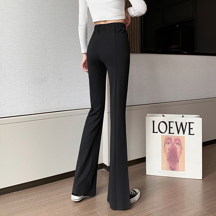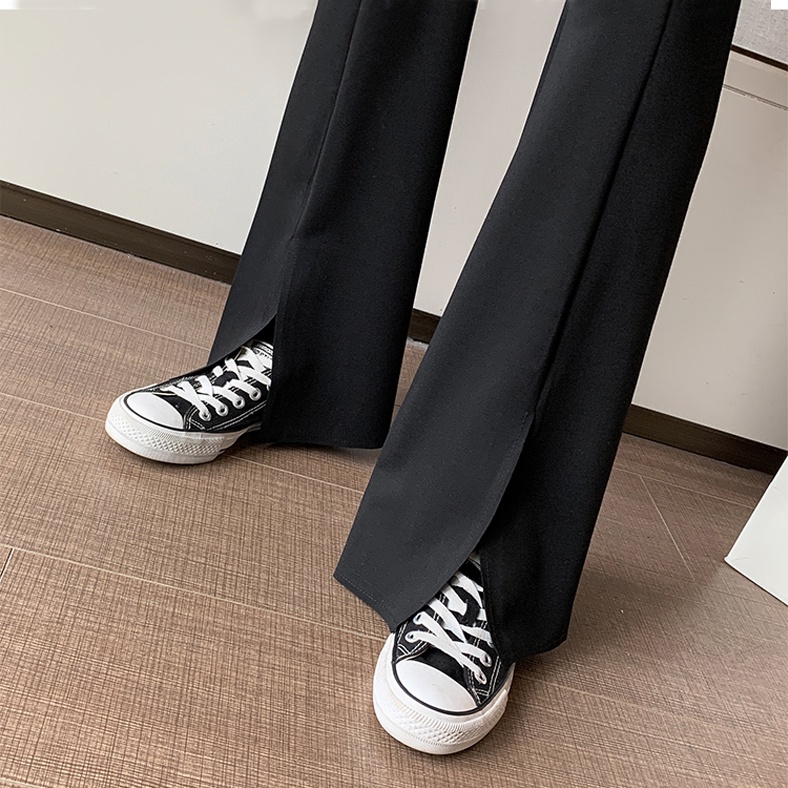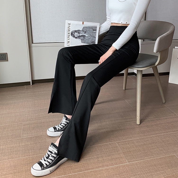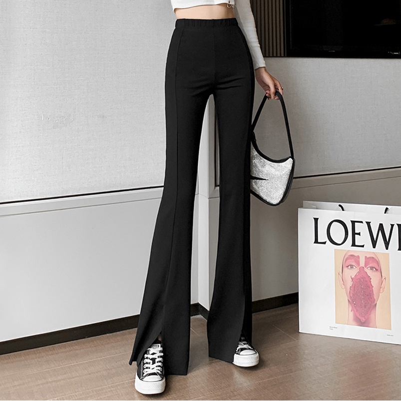 彈力開岔喇叭黑褲【131】PAPI 春夏新款修身顯瘦韓系INS居家寬褲開岔褲氣質喇叭褲 黑色長褲 高腰長褲 休閒長褲女
