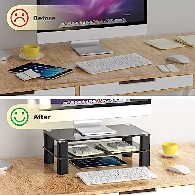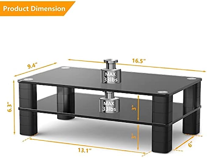 ☝MONITOR STAND SIZE - Product dimension 16.5"L * 9.4"W *6.3"H, this glass monitor stand is suitable for most of devices. The legs on the riser are very easy to adjust to the ideal height, total 6 different heights for optional. The space between legs is 13.1"L * 6"W, perfectly for storing your office supplies.