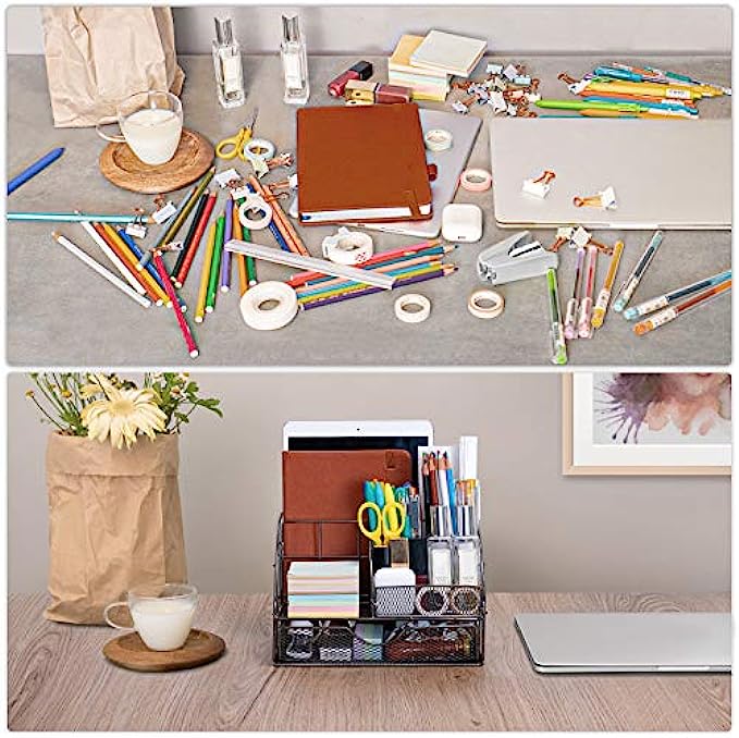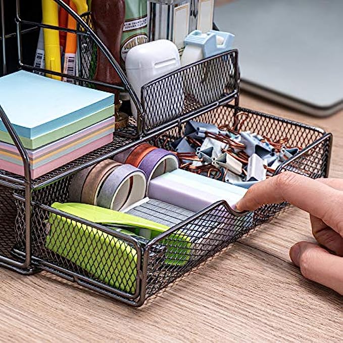 EASY ACCESS: Mesh design allows you to easily find anything you need. Our desk organizer’s pull-out drawer slides in and out smoothly and effortlessly upon tug. The office desk organizer comes fully assembled; just unbox and go. Having a tidy desk makes you work twice as fast and helps you become more creative throughout the day!