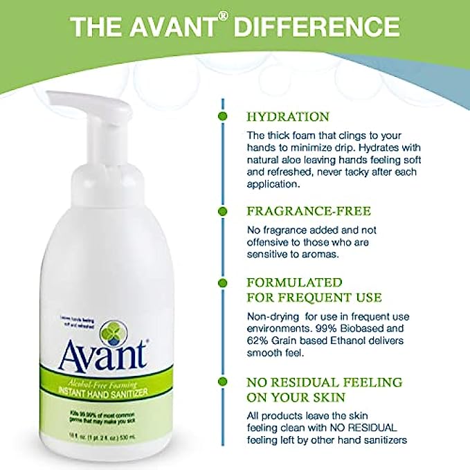 ALCOHOL-FREE: Avant Alcohol-Free foaming instant hand sanitizer kills 99.99% of most common germs. The bio-based, fragrance-free formulation is powered by Benzalkonium Chloride, a safe and effective antiseptic.