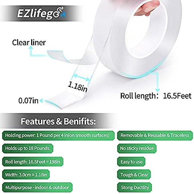 【EASY TO USE】- Size: length 16.5 Feet ,width 3.0cm(1.18in) ,thickness 0.07in.Strong Holding Power: Holds up to 18 pounds on smooth surfaces (1.2 pounds per 4 inches). It can be easily cut to any size or length you require.All you need to do is to stick the tape to the surface of the item.