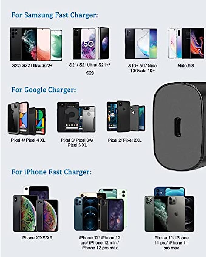 Super Fast Charger Type C Universal : Optimized high-speed super fast charging Samsung Galaxy S22,S22Ultra,S22+,S21,S21+,S21Ultra,Z Fold 3 5G,Z Flip 3,Note 20,S10, S10+ Plus, S10 5G, S20, S9, S9+ Plus, S8, S8+ Plus / Active, Note 10,Note 10 plus, Google Pixel, Pixel 2, Pixel 3, Pixel XL, Pixel 2XL, Pixel 3XL, Pixel 4XL, Pixel 3A, LG G7 Thing, G8, G6, G5, Stylo 4, V20, V30, V35, V30S, V40 ThinQ Plus,2018 and up iPad Pro 12.9, 11 and More. (usb c charger, type c fast charger)