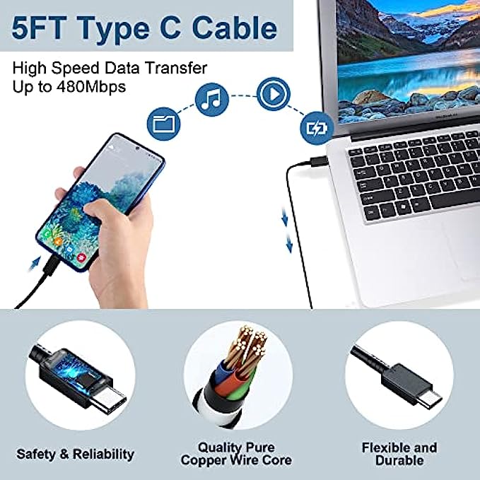 5FT Type C Charger Fast Charging Cable: USB-C connector offers a user-friendly reversible design, fast Charging and transferring, Up to 480 Mbps data transfer speed; power output up to 3Amp