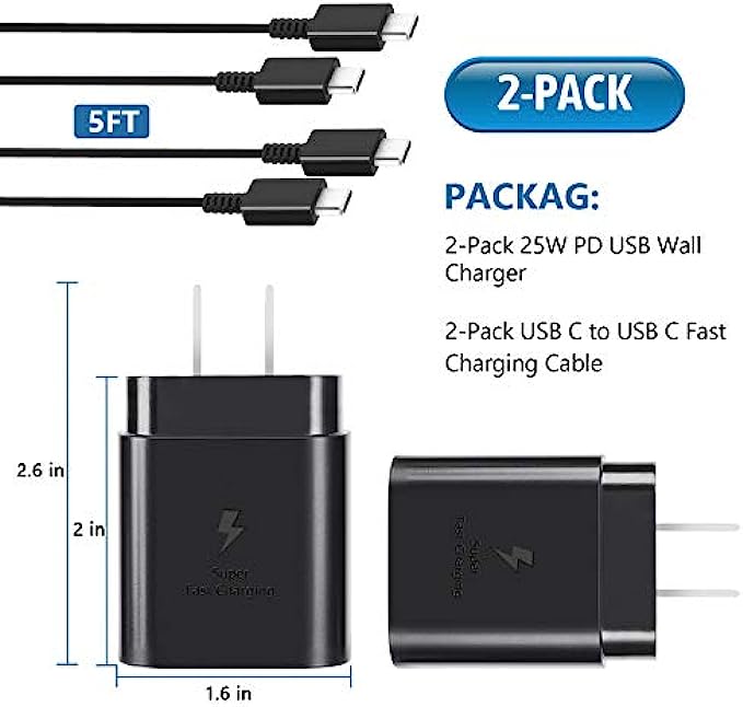 Package Included: 2 x 25w power delivery wall charger plug, 2 x 5ft type C charging Cord , if there are any quality problem, please contact us