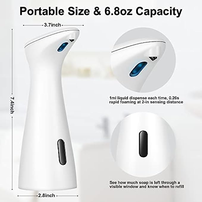 ?【Convenient Operation】Press the ON/OFF key to turn the soap dispenser on or off. Rational liquid inlet makes refilling easy. 6.8oz. small and exquisite liquid soap pump can work with hand sanitizer, shampoo, dish soap, or other liquid soaps. Please feel free to contact us if you have any problem