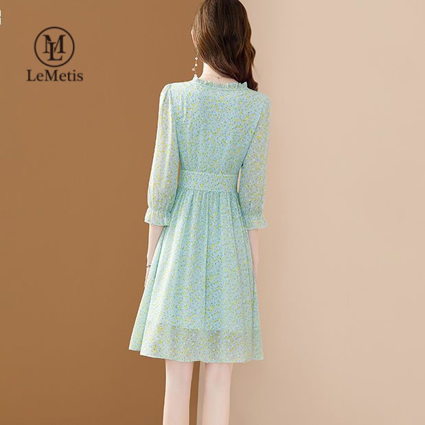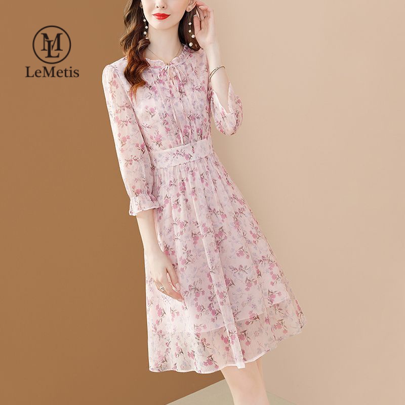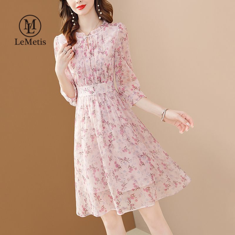 LeMetis Chiffon Floral Printed Dresses for Women 3/4 Sleeve Round-Neck Elegant Midi Dress
