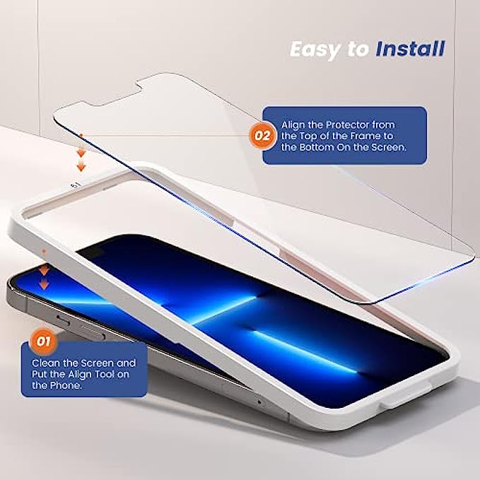 • Instruction of Install for iPhone 13 Pro Max Tempered Glass:Super Easy to Install the 6.7" Glass Screen Protector with an Installation Guidance Frame to Assist with the Application Process.