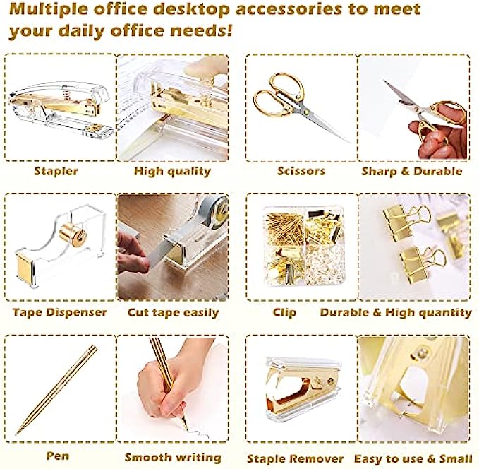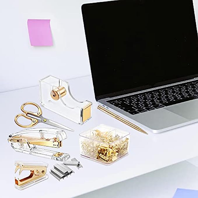 【Material】Stapler, Tape Dispenser and Stapler Remover are mainly made of acrylic and metal, smooth and comfortable to the touch, not easy to break, durable. The color is clear and bright, elegant and beautiful, very suitable for desktop office supplies.