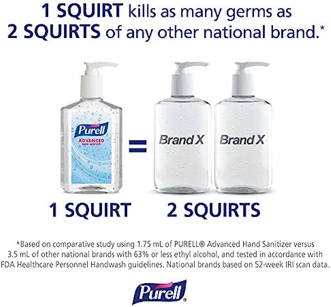 2X Sanitizing Strength. 1 squirt of Purell Advanced Hand Sanitizer equals 2 squirts of other national brands. Outperforms other sanitizers ounce-for-ounce