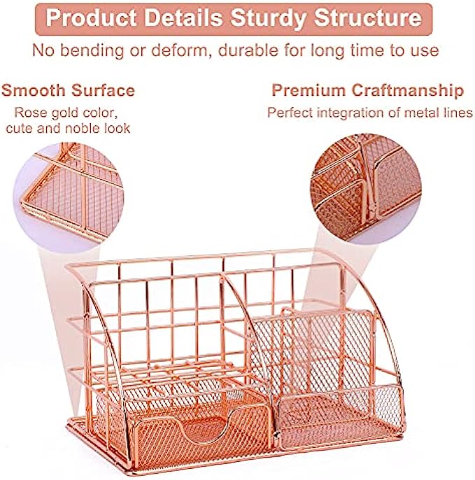 FIT FOR YOUR DESK:Compact size and smart-looking make it fits your desk perfectly, allows you have enough space at your desk. Made of sturdy steel mesh with a solid base and beautiful rose gold finish, can be used for long time.