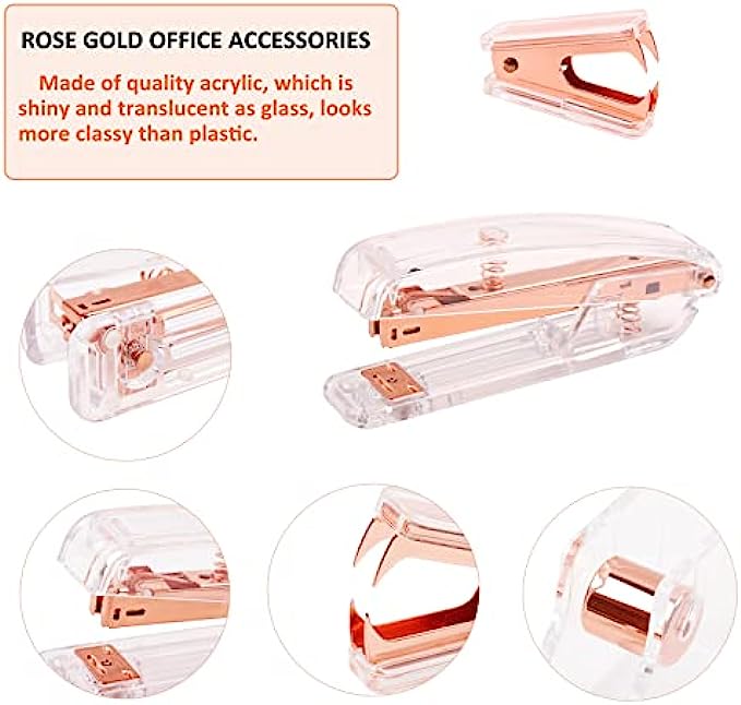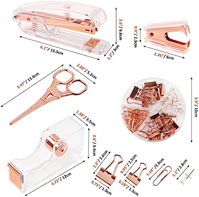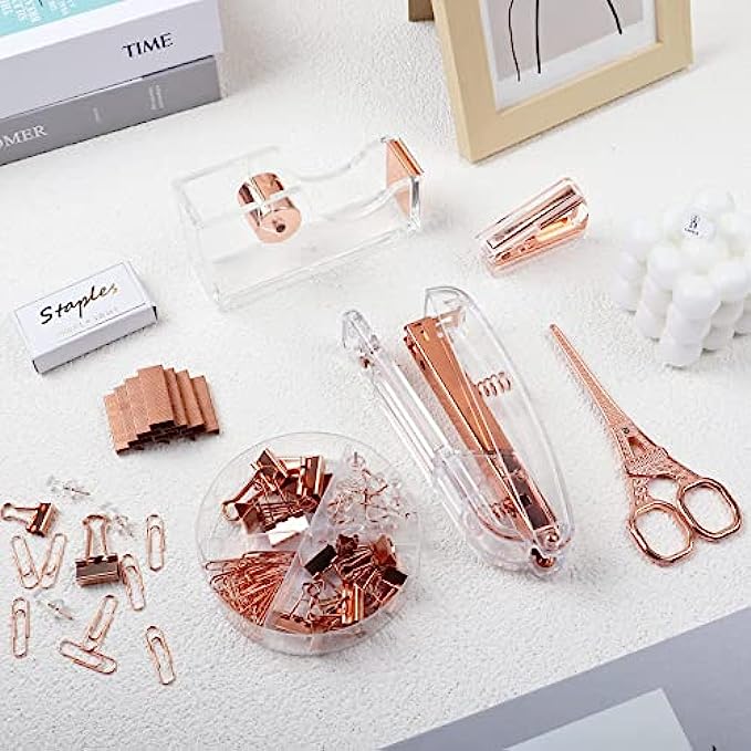 ?ROSE GOLD DESK ACCESSORIES INCLUDES -- 1* Stapler , 1* Tape Dispenser, 1* Rose Gold Scissors, 1* Mini Stapler Removers, 7* 0.75" Binder Clips, 15* 0.59" Binder Clips, 30* Paper Clips, 20* Push Pins and 1000* Staples