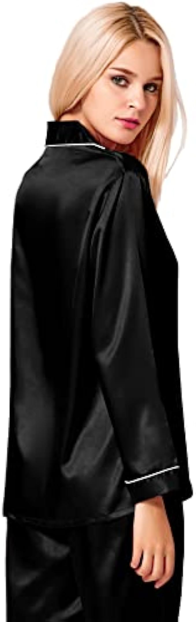 SWOMOG Womens Silk Satin Pajamas Loungewear Two-piece Sleepwear Button-Down Pj Set