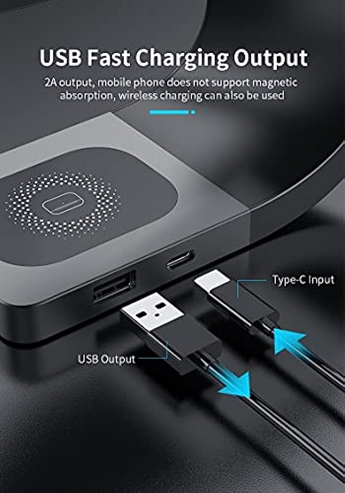 【Neat Desktop&Protection Equipment】 Wireless charging station only needs a cable to charge.It keeps your desk tidy and clean,which reflected the sense of high-tech.Wireless charging stand reduced the friction of USB or Lightning ports. Phone charging station is covered with a soft material,which can protect your device from accidental scratches.Phone and watch charging station base adopts non-slip mat design,prevents the devices from easily sliding off.