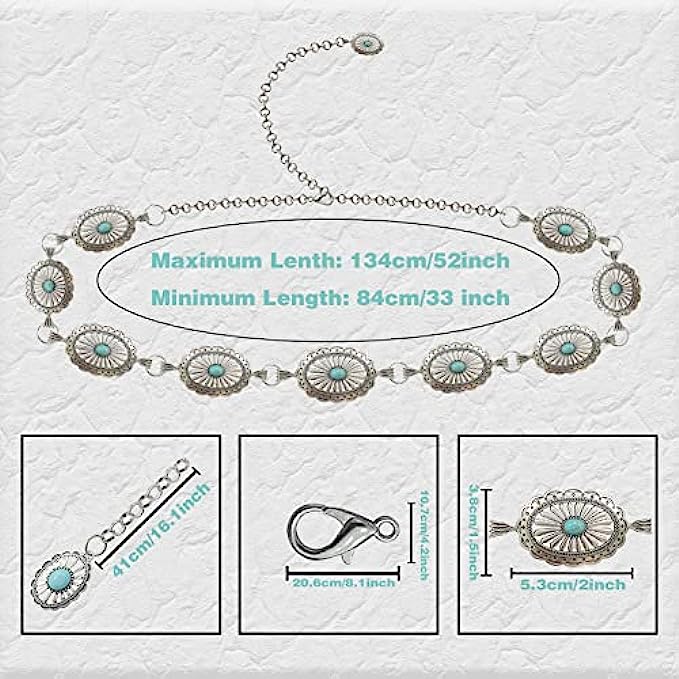 • Material and Size: The western belt for women is mainly made of high quality metal and faux turquoise material, strong and durable, not easy to fade or break, the belt is about 134cm/52.7 inches in length, weighs about 170g/6oz, lightweight and comfortable to wear, metal shell Length 5.3cm/2 inches, width 3.8cm/1.5inch, suitable for most people to wear.