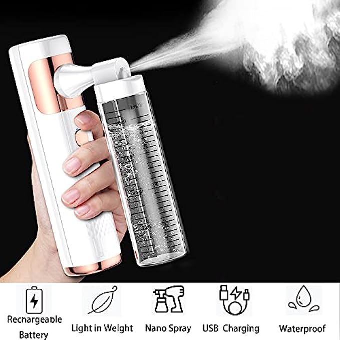 [Important Note] Do not put the nano spray upside down during use to prevent the liquid from leaking out through the air holes at the nozzle.After use, please discard the remaining liquid and clean the equipment. If you have any questions, you can contact us and we will give you the best service.