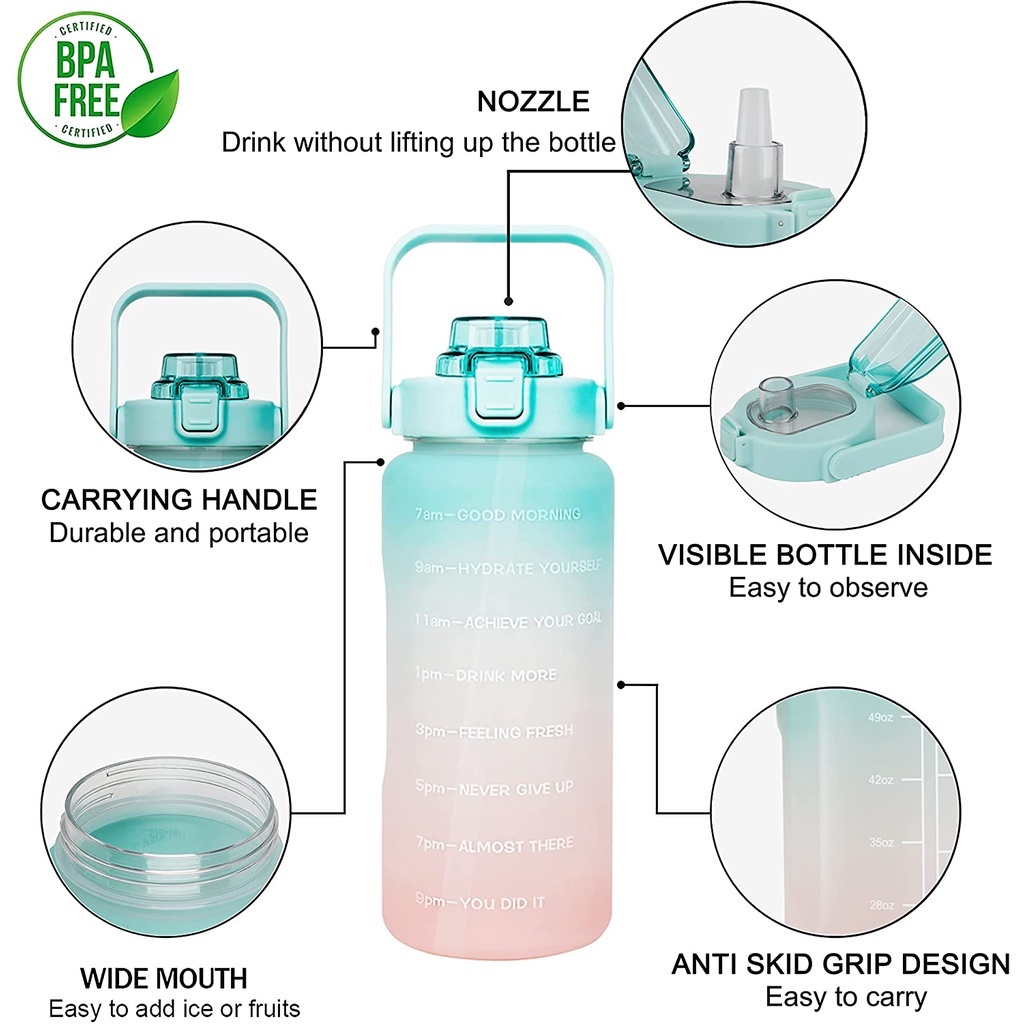 Gemful Large Water Bottle 2L with Time Marker and Straw BPA-Free 水瓶 Botol Air Sukan